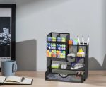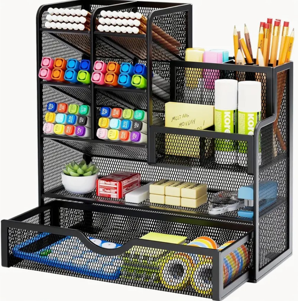Enhanced Metal Desk Organizer with Drawer – Versatile Pencil and Pen Holder with Clip-On Closure – Perfect for Office and Art Supplies Organization (Black)